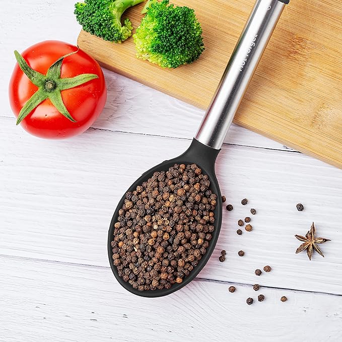 MORE SAFE AND HEALTHY: Unlike other ordinary sellers, we pay more attention to the safety of product materials.Our silicone cooking spoons are made of food-grade silicone, free of BPA. Even at high temperatures of 446℉ (230℃), there is no need to worry about melting or deforming. At the same time, the soft silicone head won't scratch the coating, which can better protect your pot.